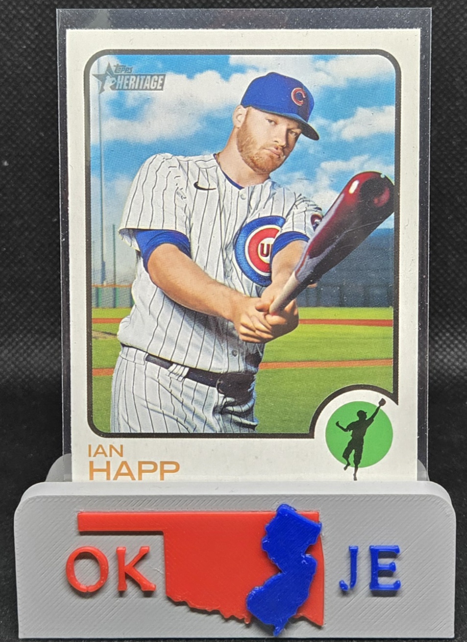 The Topps 2022 Heritage Series Ian Happ card (#221) features a vintage-inspired design reminiscent of 1973 Topps Baseball. The card showcases Happ in his Chicago Cubs uniform, captured in a classic pose against a textured background. The detailed back includes career stats and a brief bio, making it a nostalgic and collectible piece for fans of the outfielder.