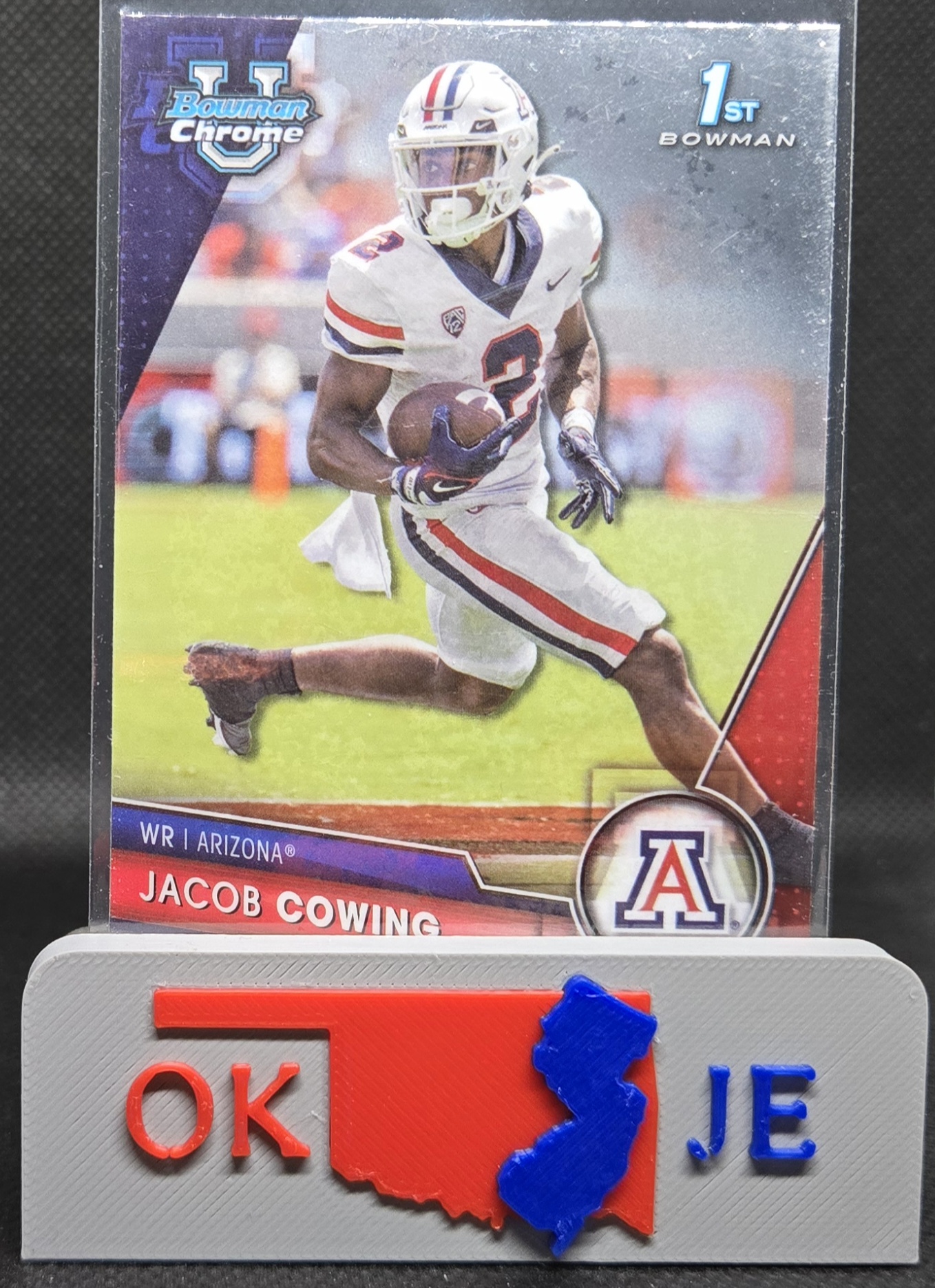 The 2023 Chrome Bowman U Base card of Jacob Cowing (#46) features a sleek, high-gloss finish with vibrant graphics, showcasing Cowing as a promising wide receiver. Highlighting his potential on the field, this card is a great addition for collectors looking to follow emerging NFL talent and future stars.